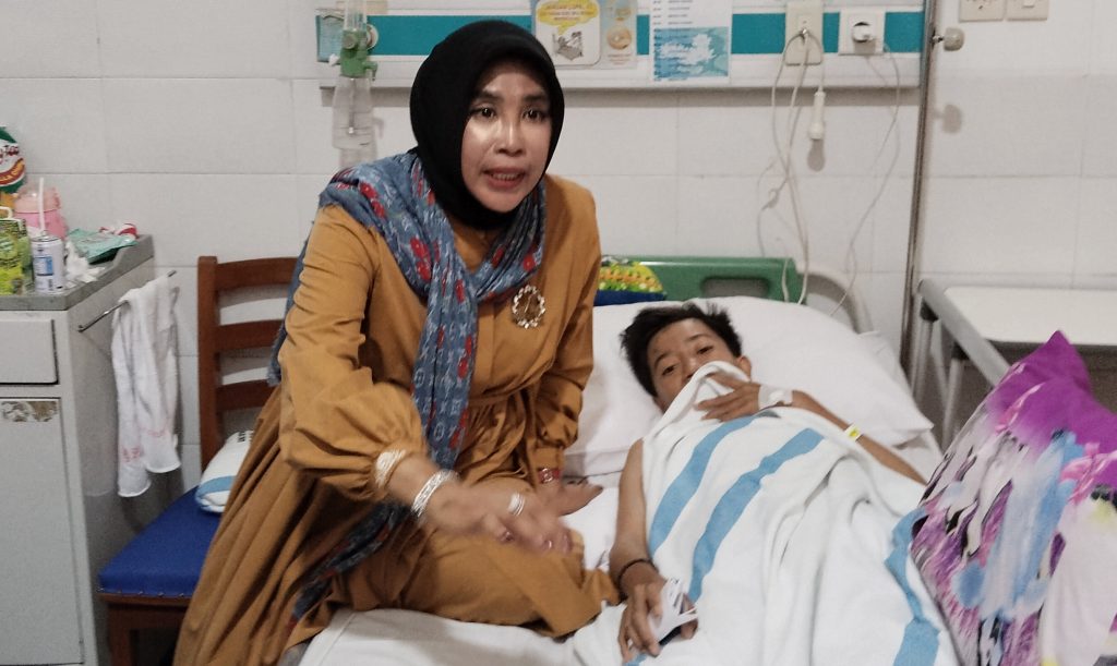 Dengan penuh empati, Wabup Mimik berusaha menenangkan dan menguatkan Rohmatulloh. “Harus tetap semangat, ya. Jangan lupa makan yang banyak supaya cepat sembuh,” ucapnya.