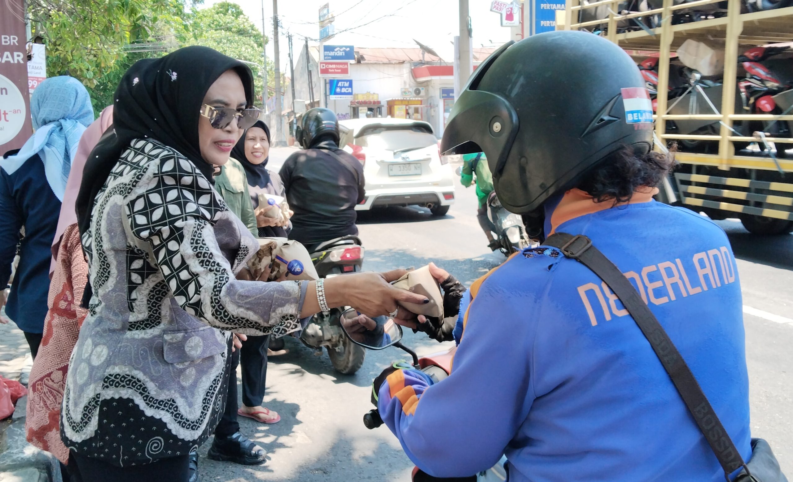Dalam kegiatan yang berlangsung penuh keakraban itu, Wabup Hj. Mimik Idayana turun langsung ke jalan bersama timnya untuk membagikan nasi bungkus kepada para pengendara motor, tukang becak, hingga masyarakat sekitar. Tak sedikit warga yang tampak antusias menerima bingkisan sederhana tersebut.