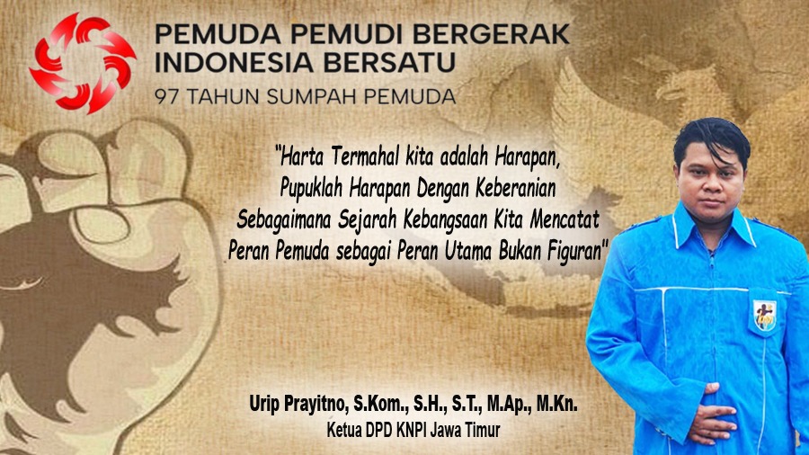 SURABAYA | JWI – Dalam momentum peringatan 97 Tahun Sumpah Pemuda, Ketua DPD KNPI Jawa Timur Urip Prayitno, S.Kom., S.H., S.T., M.Ap., M.Kn. menyerukan semangat persatuan dan keberanian kepada seluruh generasi muda Indonesia untuk terus bergerak dan menjadi aktor utama dalam membangun bangsa.Selasa,(28/10/2025).