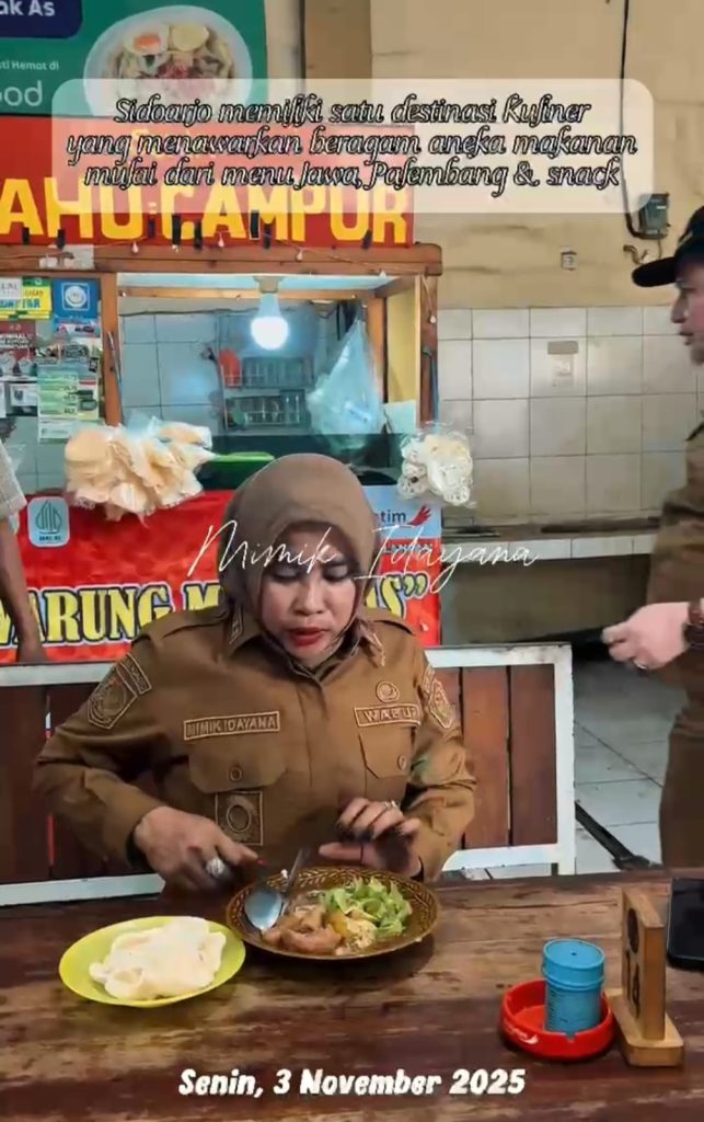 SIDOARJO | JWI – Wakil Bupati Sidoarjo, Hj. Mimik Idayana, meninjau langsung aktivitas para pelaku usaha di Pusat Kuliner Gajah Mada, Sidoarjo, pada Senin (3/11/2025). Dalam kunjungan tersebut, Wabup yang didampingi sejumlah pejabat setempat menyempatkan diri mencicipi salah satu hidangan khas di stan kuliner tradisional.