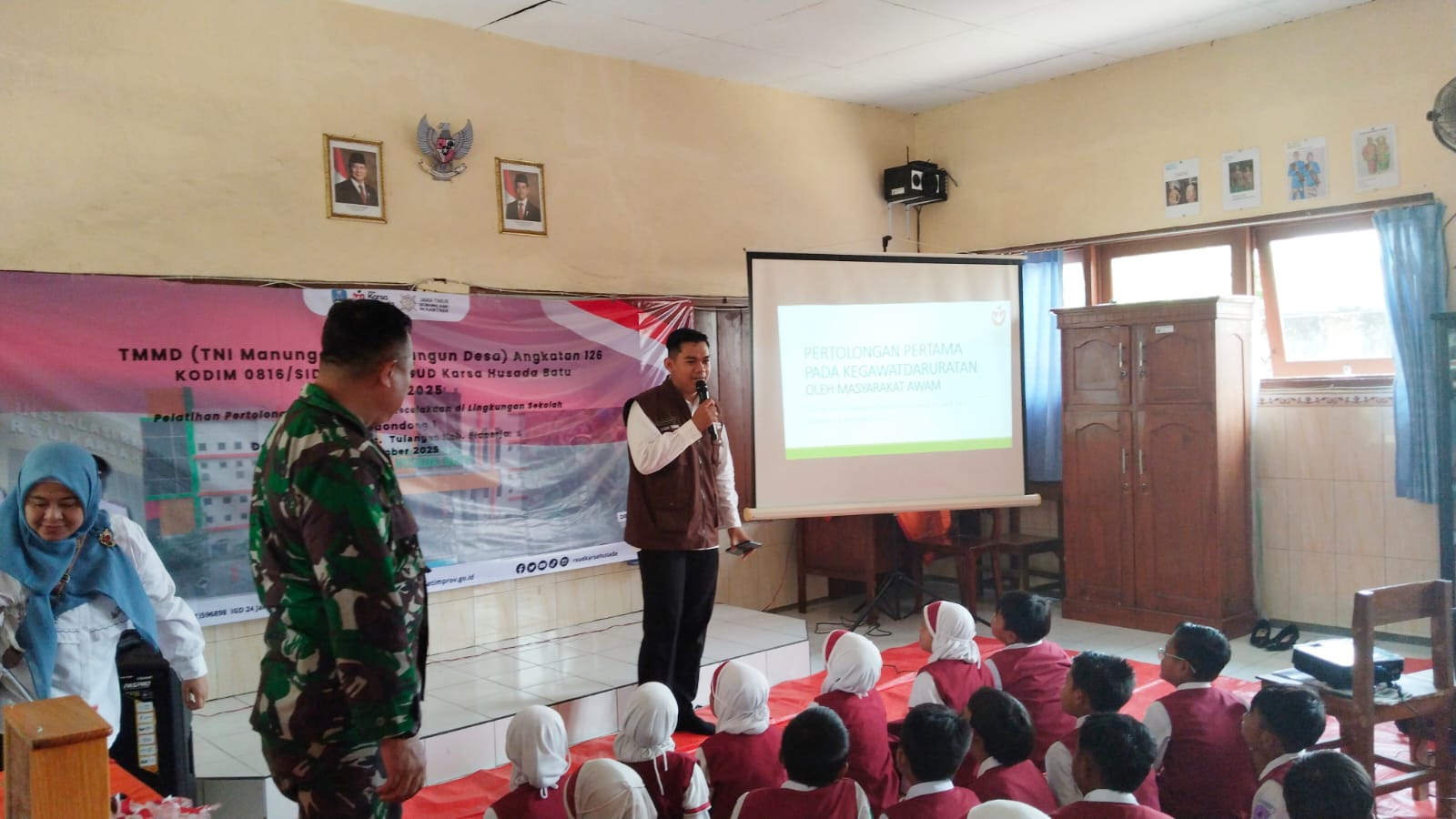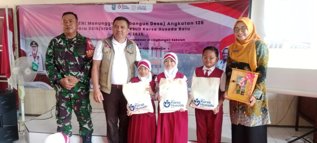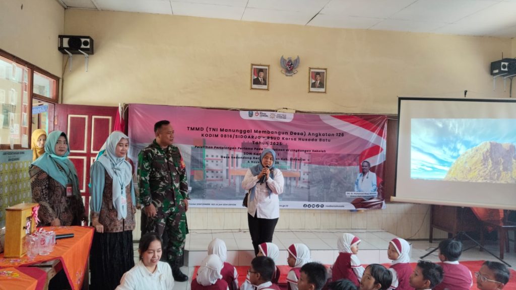 SIDOARJO | JWI – Dalam rangka mendukung kegiatan TNI Manunggal Membangun Desa (TMMD) ke-126, Kodim 0816/Sidoarjo melalui Babinsa Koramil 0816/05 Tulangan bekerja sama dengan tim medis RSUD Karsa Husada Batu melaksanakan kegiatan sosialisasi dan edukasi pertolongan pertama pada kecelakaan (P3K) bagi siswa SDN Kedondong 1, Kecamatan Tulangan, Kabupaten Sidoarjo, Selasa (4/11/2025).