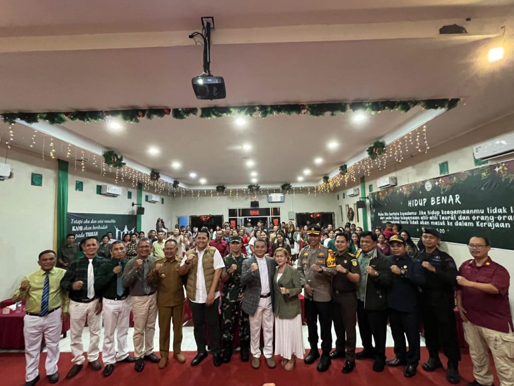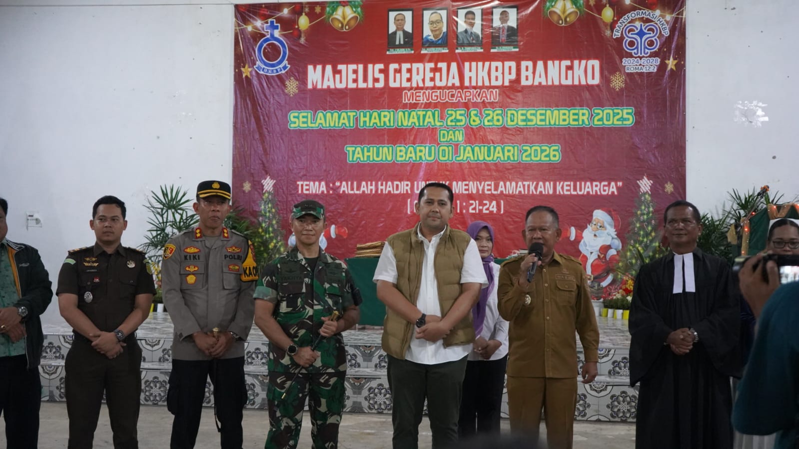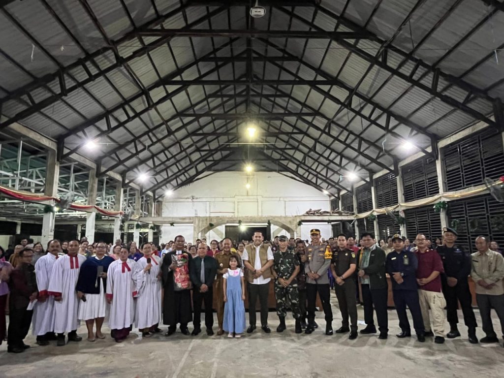 BANGKO | JWI – Bupati Merangin, M. Syukur, bersama Wakil Bupati A. Khafidh dan jajaran Forum Koordinasi Pimpinan Daerah (Forkopimda) Kabupaten Merangin melakukan kunjungan ke empat gereja di Kota Bangko, Rabu malam (24/12/2025).