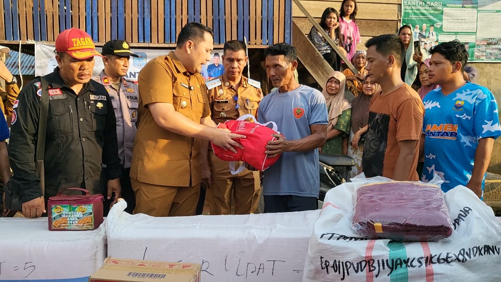 Kepala Dinas Kominfo Merangin, Ahmad Khoiruddin Agung Saputro, turut menyerahkan bantuan berupa pakaian layak pakai yang dihimpun dari para pegawai Diskominfo. Bantuan tersebut diterima langsung oleh kepala desa setempat yang menyampaikan apresiasi dan terima kasih atas perhatian pemerintah daerah.
