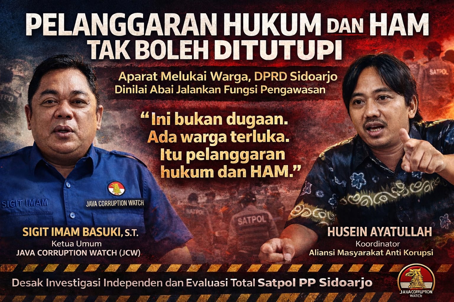 Aliansi Masyarakat Anti Korupsi bersama Java Corruption Watch mendesak DPRD Kabupaten Sidoarjo untuk segera membentuk tim investigasi independen dan merekomendasikan proses hukum terhadap oknum Satpol PP yang terlibat dalam tindakan kekerasan tersebut.