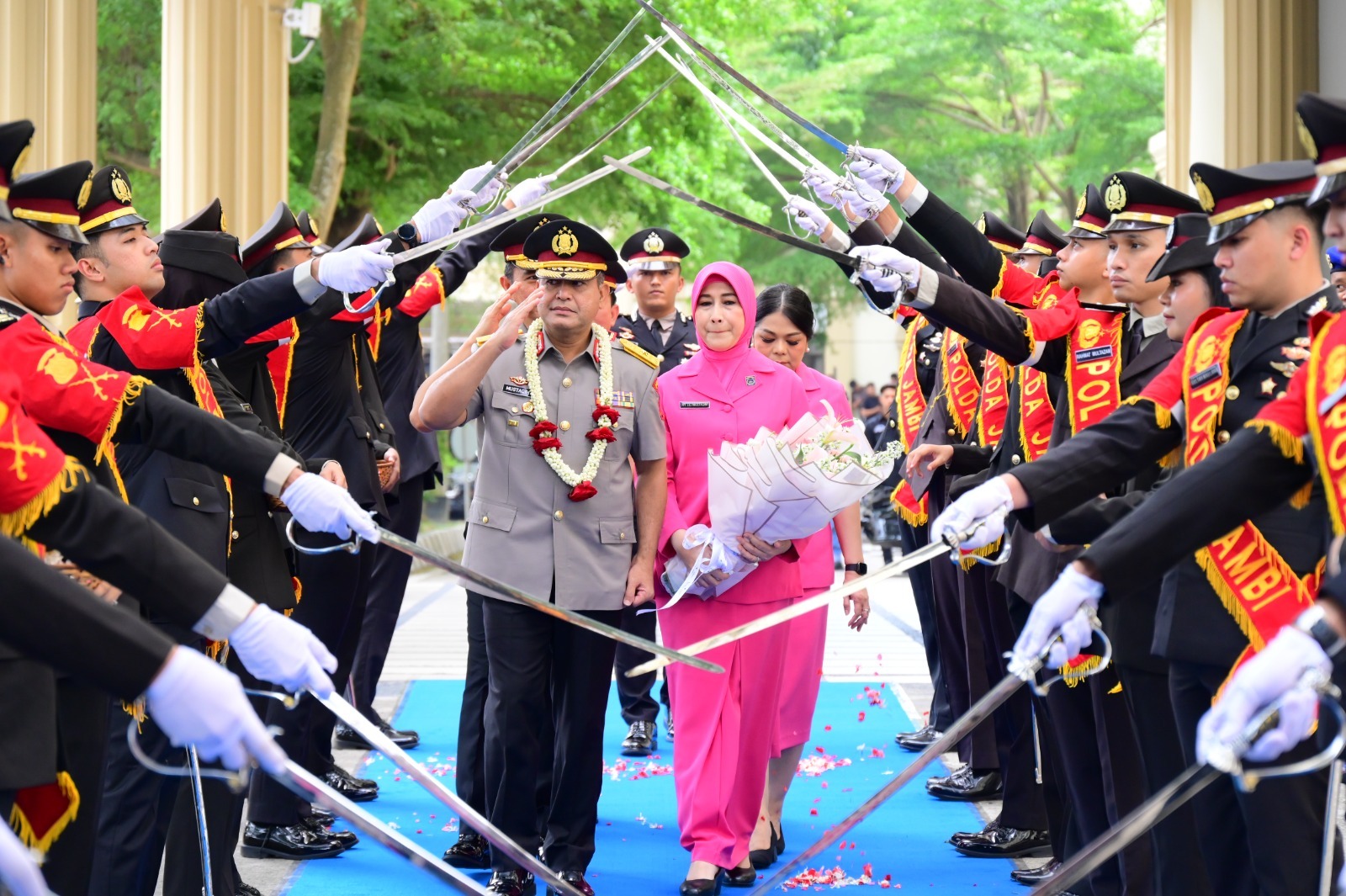 Prosesi pelepasan berlangsung khidmat dan sarat nuansa kekeluargaan. Tradisi pedang pora mengiringi langkah Brigjen Pol. M. Mustaqim saat berpamitan dengan seluruh jajaran Polda Jambi, sebagai bentuk penghormatan atas dedikasi dan pengabdian selama bertugas.