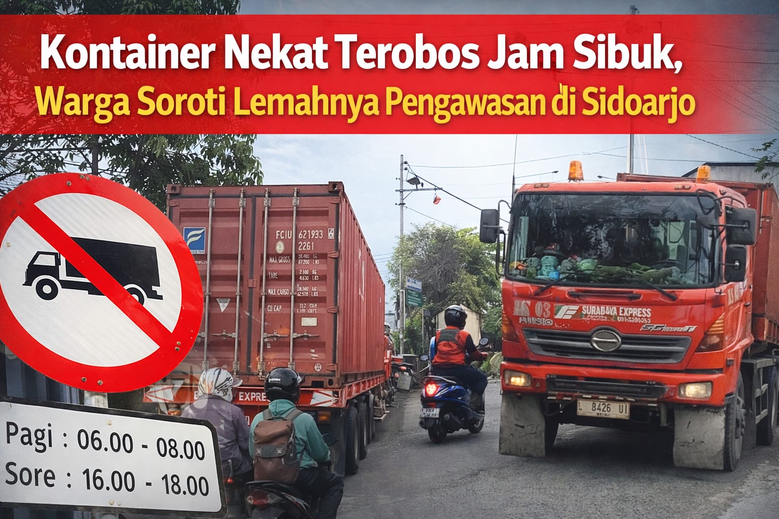 SIDOARJO | JWI – Kebijakan pembatasan jam operasional kendaraan berat di ruas jalan penghubung Gedangan–Buduran, Kabupaten Sidoarjo, dinilai belum berjalan efektif. Pasalnya, kendaraan besar jenis kontainer masih terlihat melintas pada jam sibuk meski rambu larangan telah terpasang di sejumlah titik.