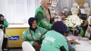 Dengan seragam hijau yang identik, mereka datang berkelompok, sebagian masih menyempatkan waktu di sela orderan. Wajah lelah tertutup senyum, menunjukkan semangat yang tak pernah padam.