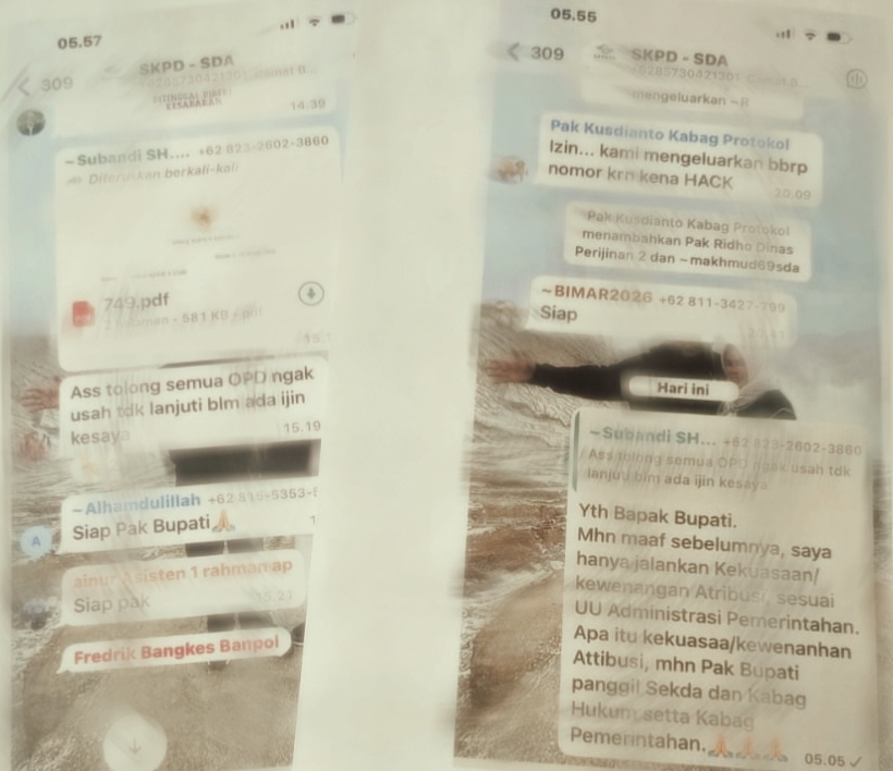 “Semua OPD tidak usah menindaklanjuti karena belum ada izin dari saya,” tulis Bupati Subandi dalam pesan di grup tersebut. Sejumlah kepala OPD pun merespons dengan jawaban singkat, “Siap Pak.”